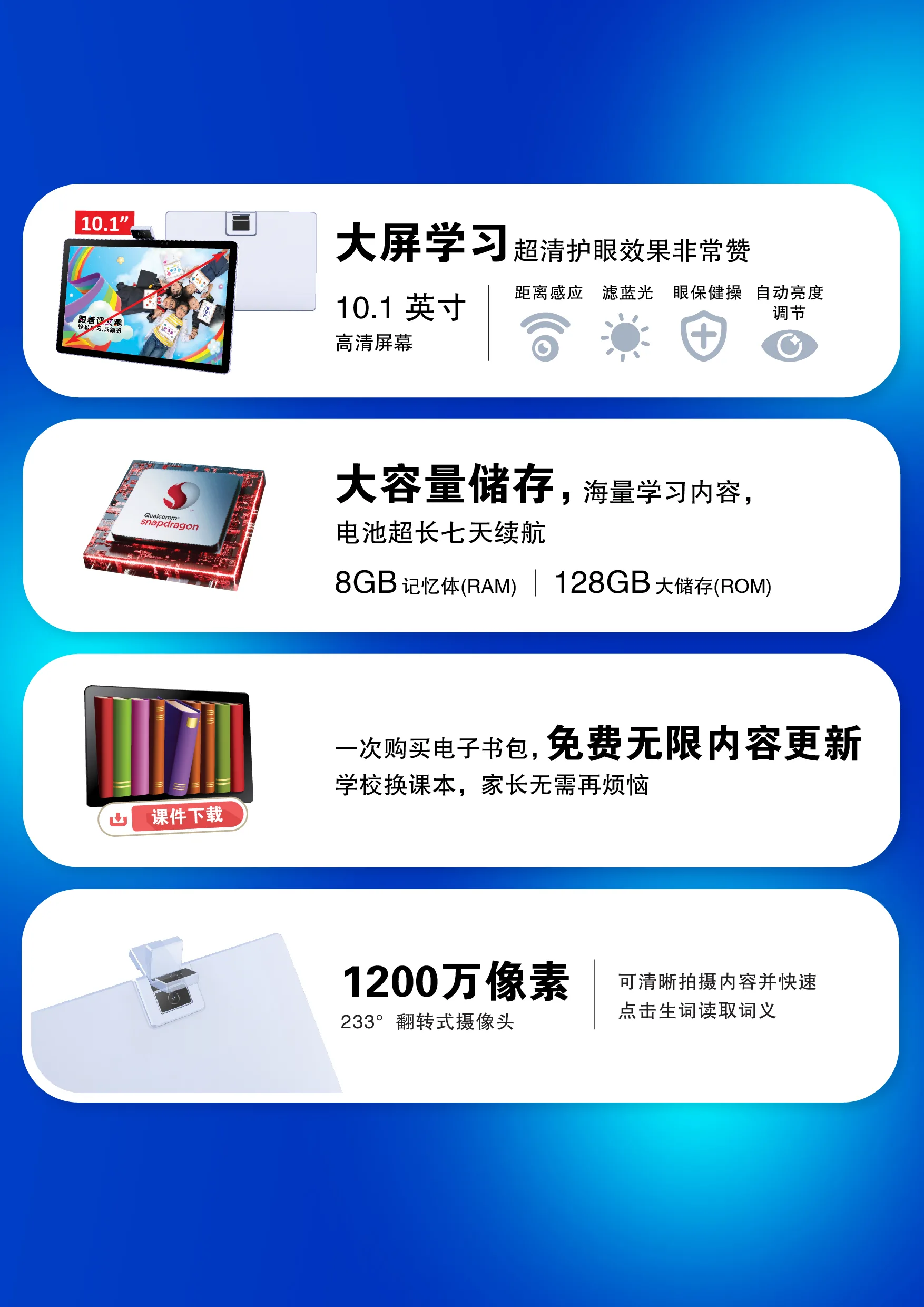 产品简介 产品规格产品型号BM118P颜色海盐蓝屏幕10.1 英寸 IPS 全高清|10 重护眼防蓝光调眼屏分辨率1200 × 1920运行内存6 GB RAM(+2 GB 扩展内存)机身存储128 GB ROM处理器8 核 64 位 高性能处理器电池5400 mAh 大容量锂电池摄像头233° 智能翻转|2 × 1200 万像素(2400 万感光单元)连线支持双频 WiFi|蓝牙接口Type-C|支持 OTG / Pendrive(最高支持 128 GB)包装清单电子书包1、USB数据线1、充电器1、多功能保护壳1产品介绍影片